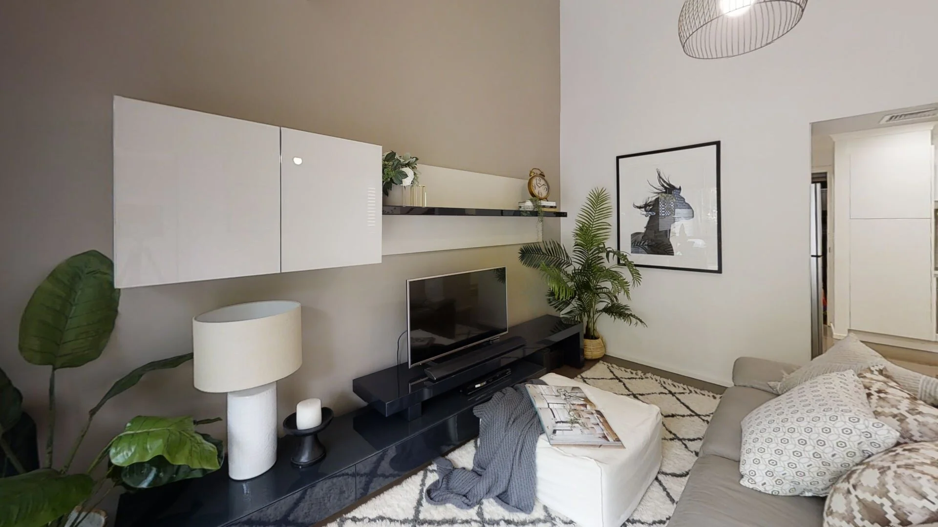 The lower level has an open plan layout, with soaring high ceilings capturing plenty of natural light and air. The central hub of this stunning residence has to be the house-size Caesar stone kitchen. There is ample storage space here, and room to enjoy cooking and entertaining.
